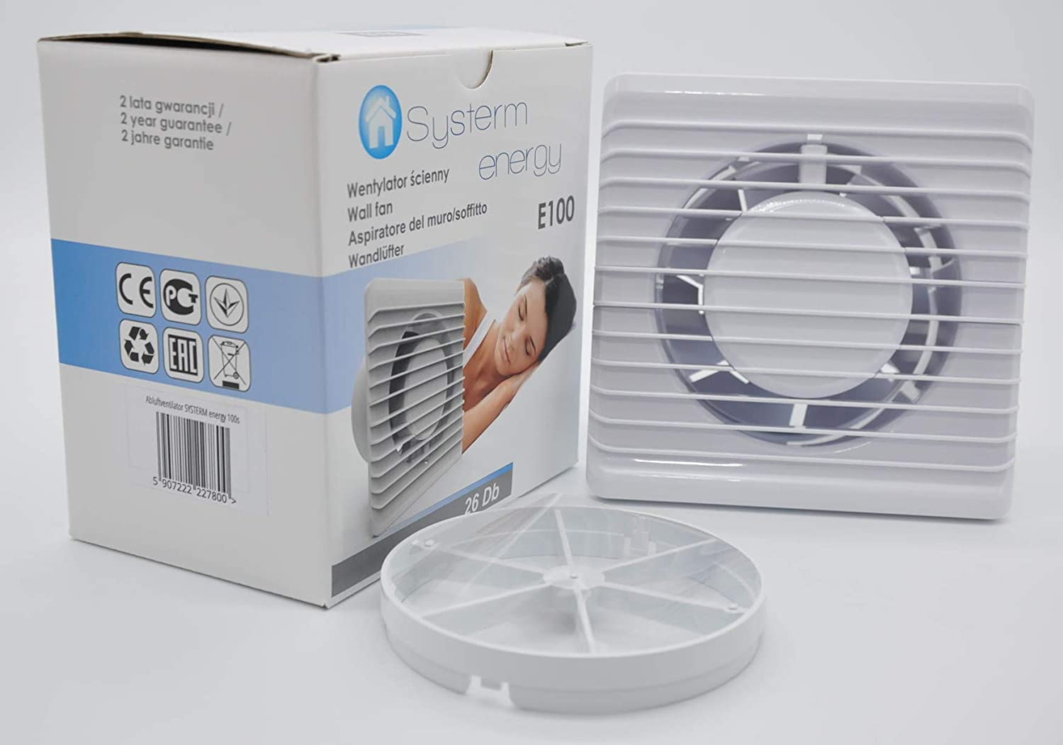 Ventilateur universel avec clapet anti-retour Ø 100mm/10cm pour salle de bain et cuisine, faible consommation d'énergie 8 W, fonctionnement silencieux 26 dB et haute efficacité 93 m3/h. Systerm Energy