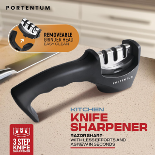 - Aiguiseur de Couteaux Manuel à Trois Étapes : Obtenez des résultats brillants à chaque fois avec l’aiguiseur de couteaux PORTENTUM. Commencez par préparer votre lame, continuez à affûter et terminez par le polissage. Ce système efficace garantit que vos couteaux de cuisine restent toujours affûtés et peut même redonner du tranchant à des lames émoussées.